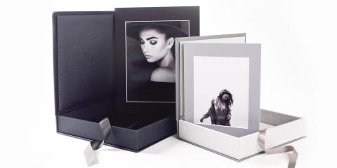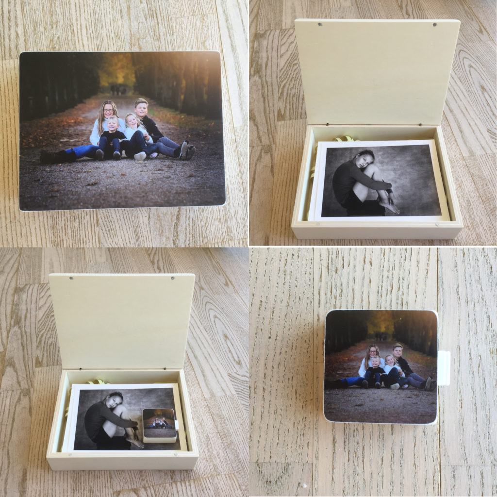 Få en rigtig lækker eksklusiv æske i tekstil eller eco læder med 10 billeder i 20 x 30 cm.